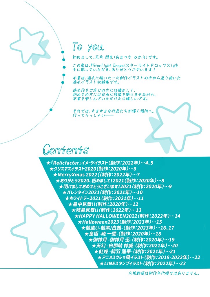”過去の軌跡を星屑のように拾い集め、新しい創作や物語を呼び覚ます雫”となるように。そんな願いを込めた1冊となります。