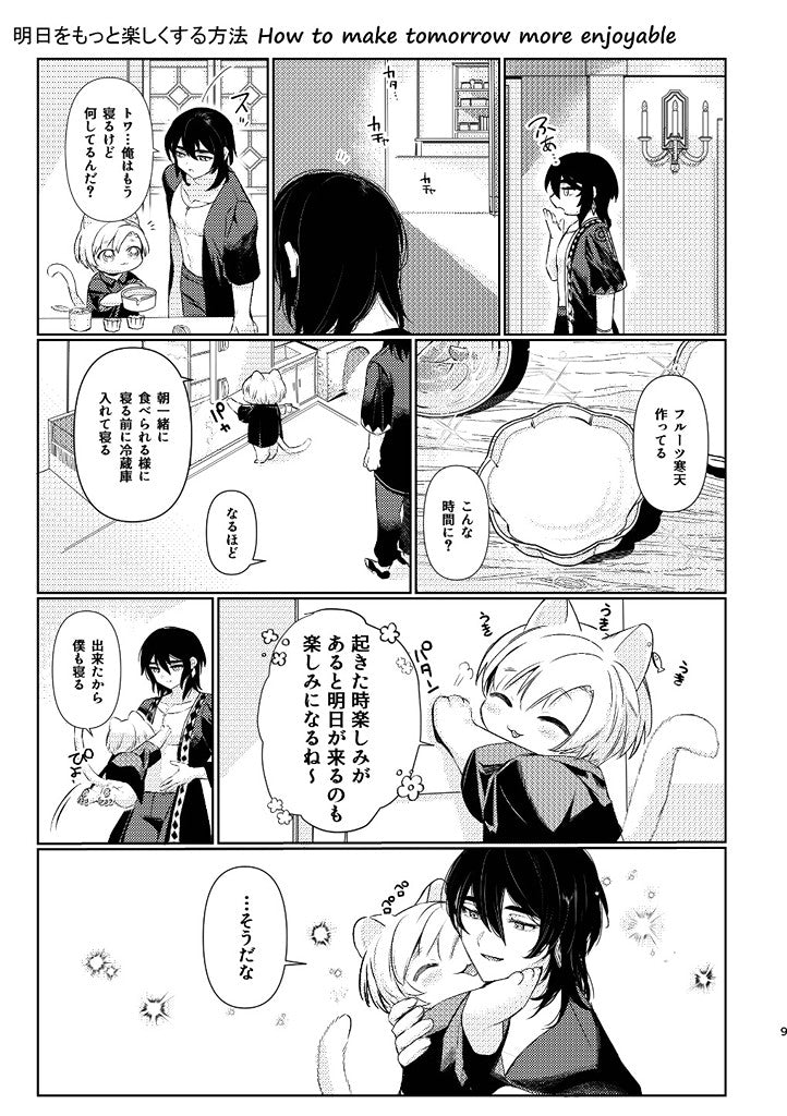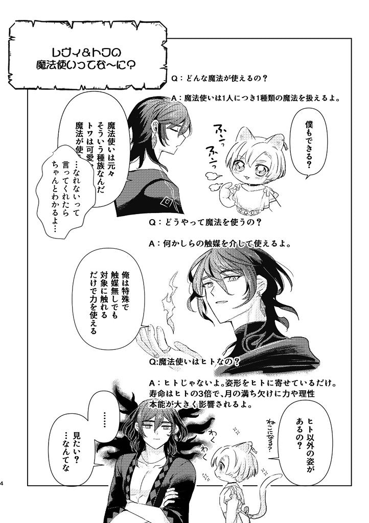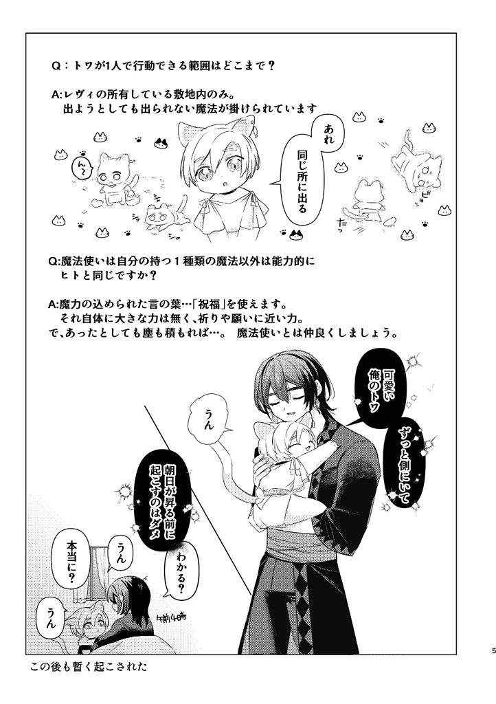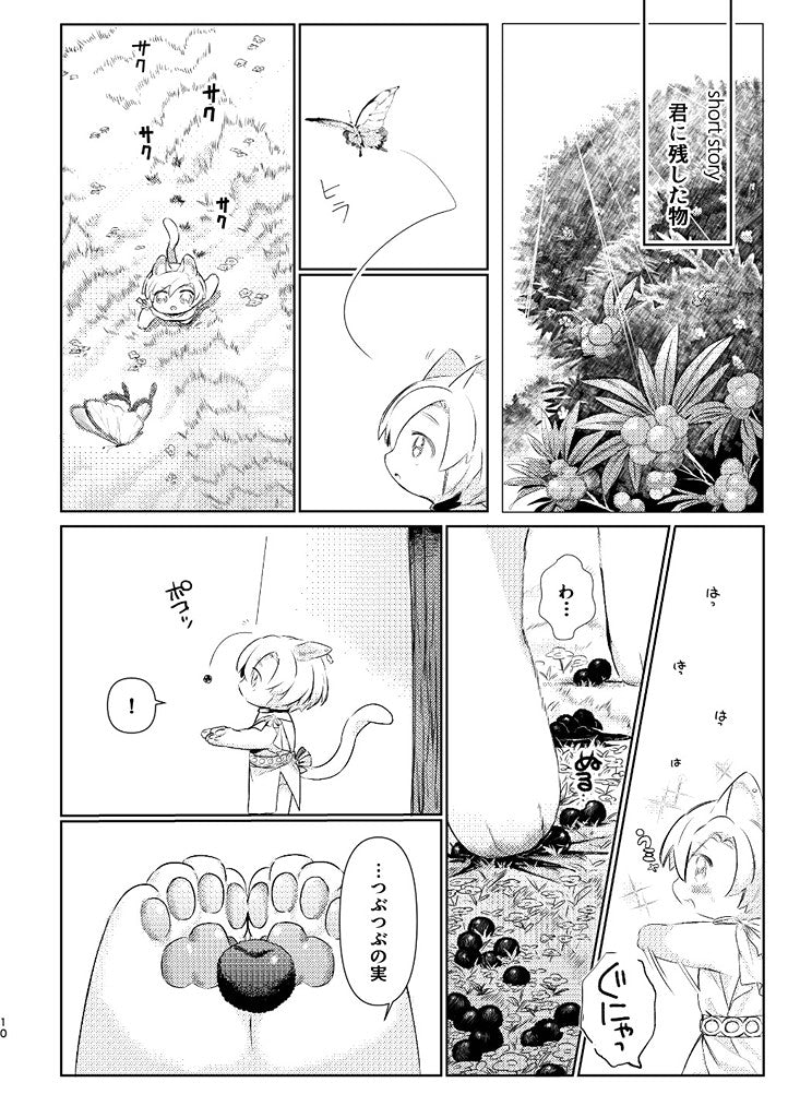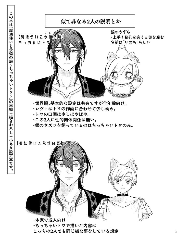 創作BL「魔法使いと永遠の庭」に出てくるケモ耳の男の子がもしもちいさきサイズだったら…。というセルフパロディな世界観で描いている絵と漫画を詰め込んだ本です。ネット上に掲載されている物の再録に加え、描きおろしで13Pの漫画を収録しています。